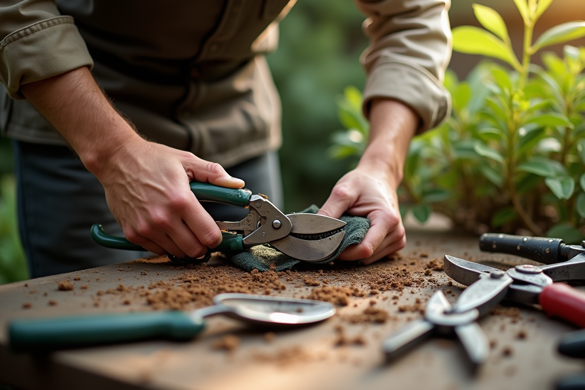 Pour des performances optimales, commencez par nettoyer vos outils coupants. Utilisez une brosse métallique pour enlever les résidus tenaces. Appliquez ensuite de l’alcool à 90° pour désinfecter les lames. Pour aiguiser, utilisez une pierre à aiguiser en suivant l’angle original de la lame. Un bon aiguisage assure une coupe nette et préserve vos plantes.