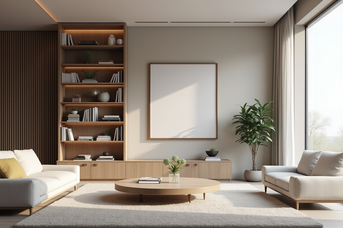 Les meubles avec rangements intégrés, comme les tables basses avec tiroirs, sont parfaits pour cacher les télécommandes, magazines et autres petits objets. Les étagères murales ajoutent du rangement sans encombrer le sol.